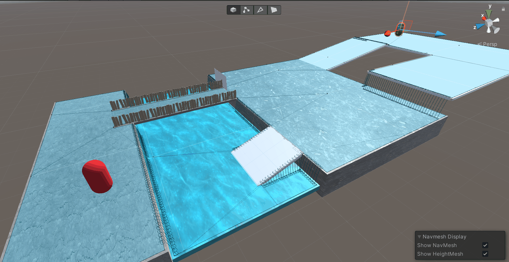 This time I used NavMesh to create the floor information. This tool provides a convenient way of transforming model surfaces into perceptible 'walkable surfaces', with jumpable edges.
